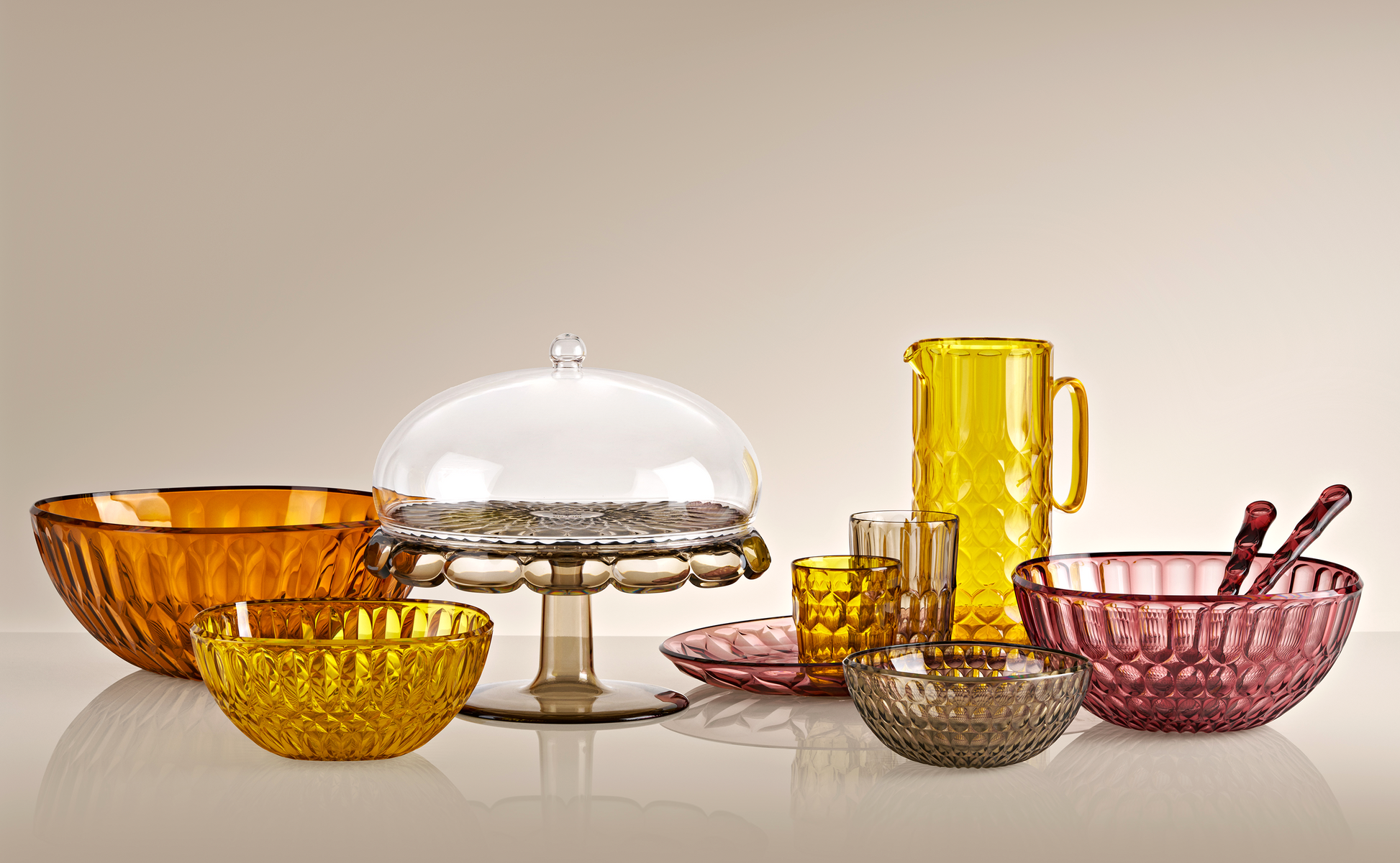Elegante set de cubiertos de ensalada en Acrílico Cristal especial Bio-Based, un material moderno, renovable, orgánico y no fósil, obtenido a partir de residuos vegetales que es, además, 100% reciclable.